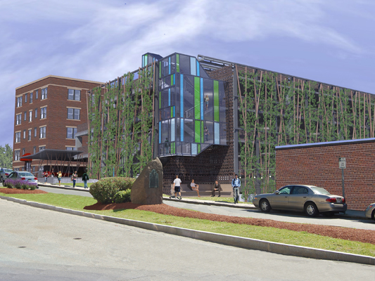 I recently came across Arquitectonica’s Bentley Bay garage green screen installation while on the hunt for precedent images for our own Medford Garage Feasibility Study. I was amazed to see in the photos I encountered a design strikingly similar to one we’re envisioning for a future municipal garage in Medford Square. Both our proposed façade system and the Bentley Bay precedent layer stainless mesh netting behind a larger-scaled composition of canted tree trunk-esque elements. While climbing vegetation typically takes several years to populate the netting, the varied pattern created by the vertical elements lends immediate visual interest to its facades while they patiently wait for vegetation to grow its way onto the mesh and up the structure…