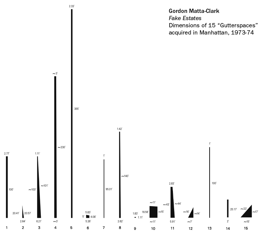 The most fruitful post-article google search was on the work of artist Gordon Matta-Clark from the 1970’s. Fake Estates: Reality Properties was one major precedent de Moncheaux cited that suggested looking for, and acting upon, these “gutterspaces”. Matta-Clark searched out and acquired 15 of these land scraps from the City of New York (at $25 a piece), with the prospect of creating a network of urban artscapes upon them. The graphics above show the official documentation on one of the spaces and an incredible graph of the dimensional weirdness of these leftover sites. Genius. Matta-Clark died at 35, before completing the project.
