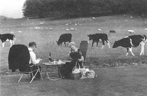 A proper English couple (representing Western Civilization) sits on their manicured lawn as closely as possible to a meadow with grazing herds of sheep and cows. A boundary is made meaningful by the difference a) in the texture and performance spec of the grass, b) the sharp definition of the line, and c) the species and behavior of the mammals on each side.