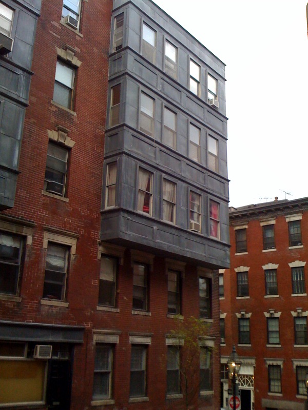 Why hadn’t I noticed them before: oversized metal bays looming over the diminutive brick row houses and streets of Boston’s Beacon Hill. And this building on Irving Street is not an anomaly; several monster bays were seen in a walk from Cambridge Street, up the hill on Irving Street and to the left on Joy Street, as I made my way to the Boston Common. In fact, oversized bays were lurking above the sidewalk everywhere that single-family rowhouses had been replaced by tenements in the 1920s on the north slope of the Hill. Once again, real estate speculators had invented a solution to grab additional real estate value within the exiting regulatory and architectural-cultural rules of a community.