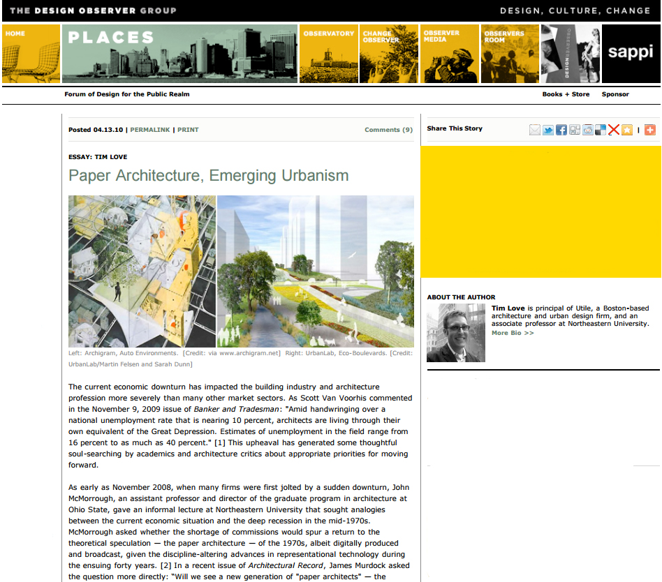 Paper Architecture, Emerging Urbanism Date Published 13 April 2010 Time 0 min read Share Copy Link, Facebook, Twitter “Paper Architecture, Emerging Urbanism” by Tim Love in Places, Design Observe, April 13, 2010.
