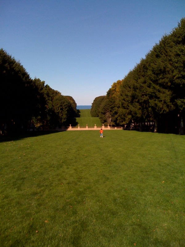 Although I have driven by the entrance to the Crane Estate hundreds of times on the way to the beach, I had never visited the gardens of the house until yesterday afternoon. The best discovery was the axial lawn (the Grand Alleé) that runs from the garden side of the house out to the horizon line of the Atlantic Ocean. The landscape and its effect were designed by landscape architect Arthur Shurcliff in 1914-1915.