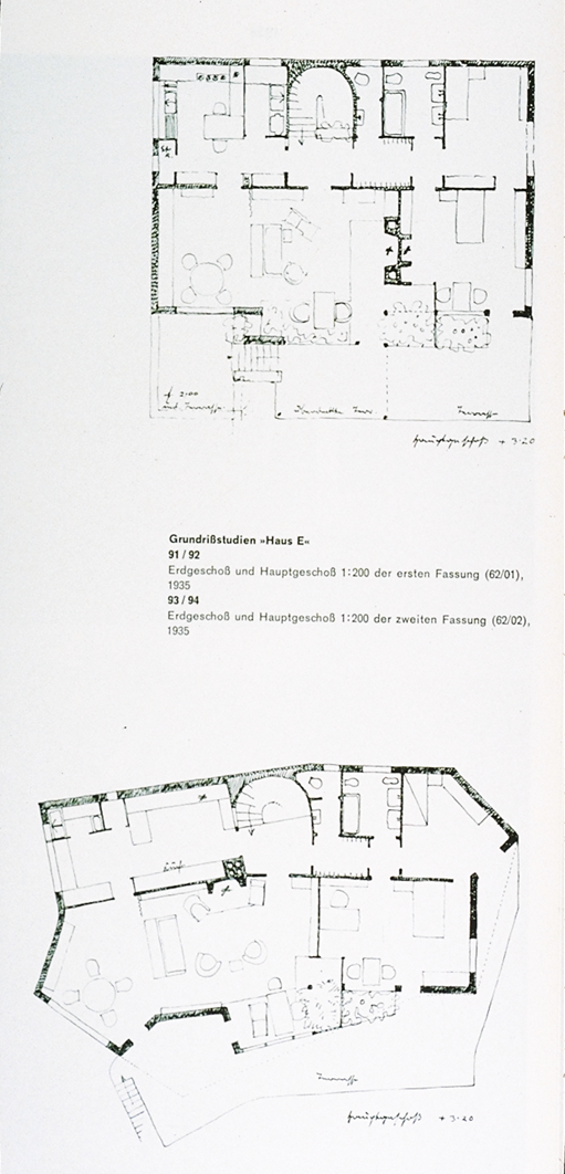 Questions of efficiency also influence finer-grain design decisions. Hugo Häring designed two versions of Haus E to efficiently communicate a polemic. The seemingly-efficient rectilinear version requires compromises of program and functionality that are rectified in the second version. Through-room circulation in the main living space is moved to the side and rooms twist and turn to capture views and sunlight during specific times of the day. Häring’s point is that the ideologically imposed ordering system denies decisions that can improve the efficiency of the plan. We can read the “benefits” of the inflections from rectilinear plan, while at the same time, the original state of the plan is still present in the revised version.