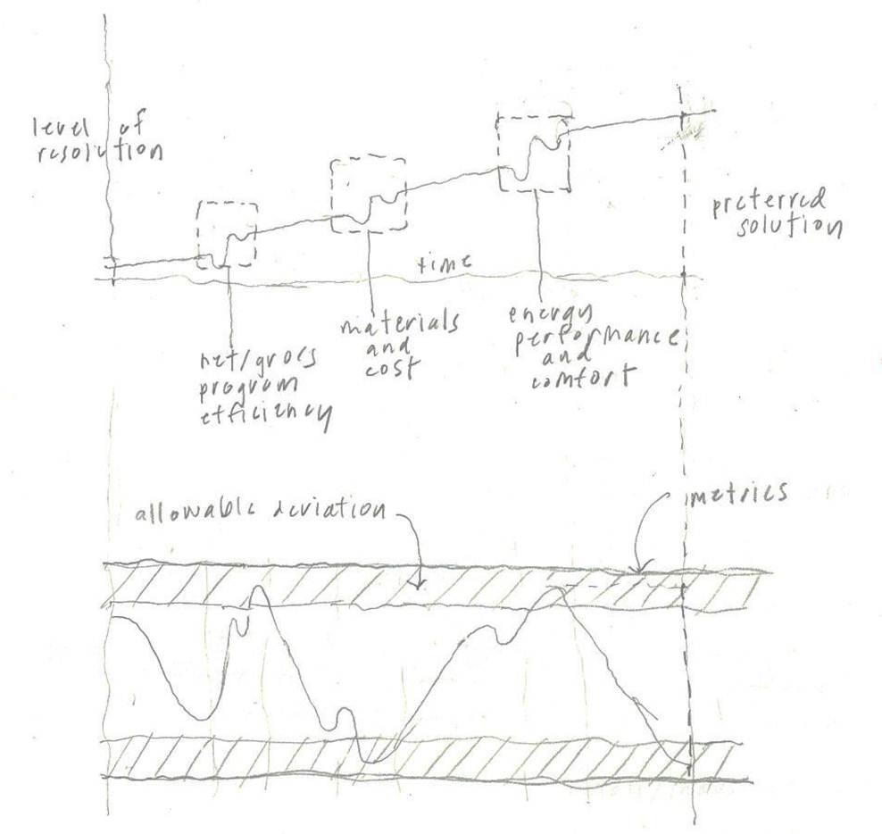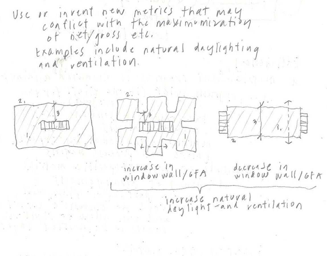 There are two ways that the metrics of efficiency can be deployed to invent defensible alternatives. The first is by using the metrics themselves to make a case for variations. The second is to use alternative or new metrics that prioritize, for example, passive environmental performance over development financing performance – yet can still lead to cost benefits. New parametric modeling tools can allow for multiple blended and weighted performance criteria, as a launching point for a project or a mid-process proof of concept.