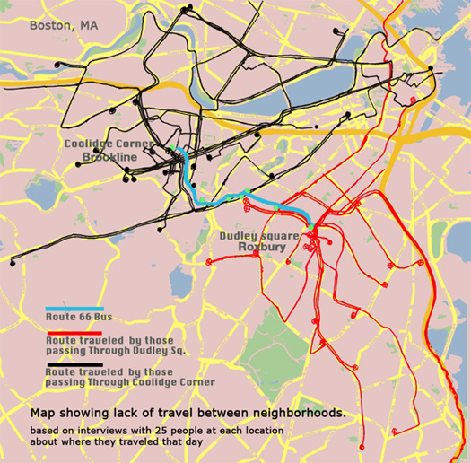 It was therefore intriguing to read about something called “virtual street corners” – a Knight Foundation-funded community art project here in Boston meant to link neighborhoods through technology.” The idea is simple: there are two portals that stream live video and audio between two carefully-chosen neighborhoods – one at Brookline Booksmith in Coolidge Corner in Brookline, and the other at Nubion Notion in Dudley Square in Roxbury. “For three weeks, the two TV portals and microphones will be open from 9 a.m. to 9 p.m. Any passerby is invited to stop and chat — about anything — with a counterpart across town.”