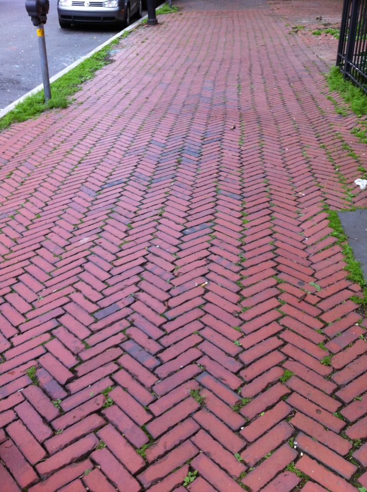 I have always liked the brick herringbone sidewalk in front of the McKim Mead & White apartment building at the corner of Charles and Beacon Streets (with the Starbucks on the ground floor). I discovered this example today at the corner of Marlborough and Berkeley Streets and next to the Belluschi-designed Lutheran church. I like the way the pattern negotiates the ups and downs of the terrain – as if it were an old rug on an uneven floor. But it turns out that herringbone brick isn’t so innocent of ideological baggage to landscape architects. It connotes a certain period of post-modernism to Reed Hilderbrand, our collaborators on City Hall Plaza and the Boston Harbor Islands Pavilion, for example. Who knew?