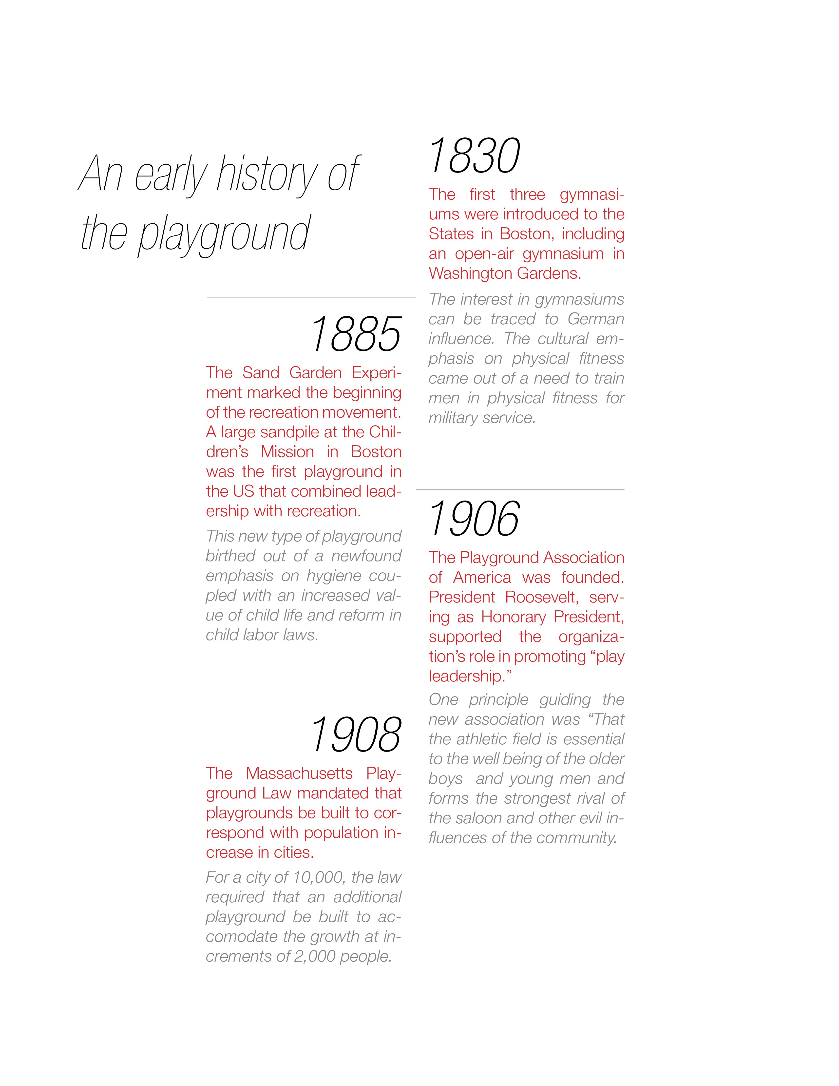 While this approach seems to be a relatively recent phenomenon in US cities, it has evolved naturally out of not-so-spontaneous cultural shifts and political movements (find out more here). Early stages of this eventual design genre are more entwined with political activism than architectural experimentation. Though there are many histories leading up to our current moment, let a take a closer look at our first category, recreate/exercise, via the playground.
