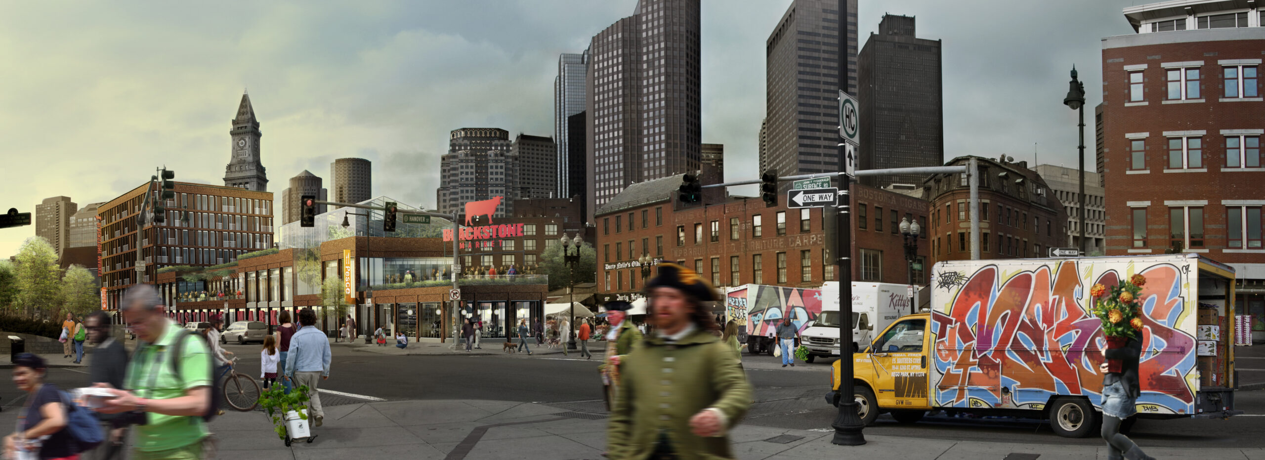 Blackstone Market was designed to be contemporary in expression while looking to the surrounding historic fabric for its scale, texture, materials, and articulation. Blackstone Market, as a physical place and in its diverse programming, would have served as an important anchor for the Market District and help define a powerful, inviting pedestrian link between Quincy Market and the North End.