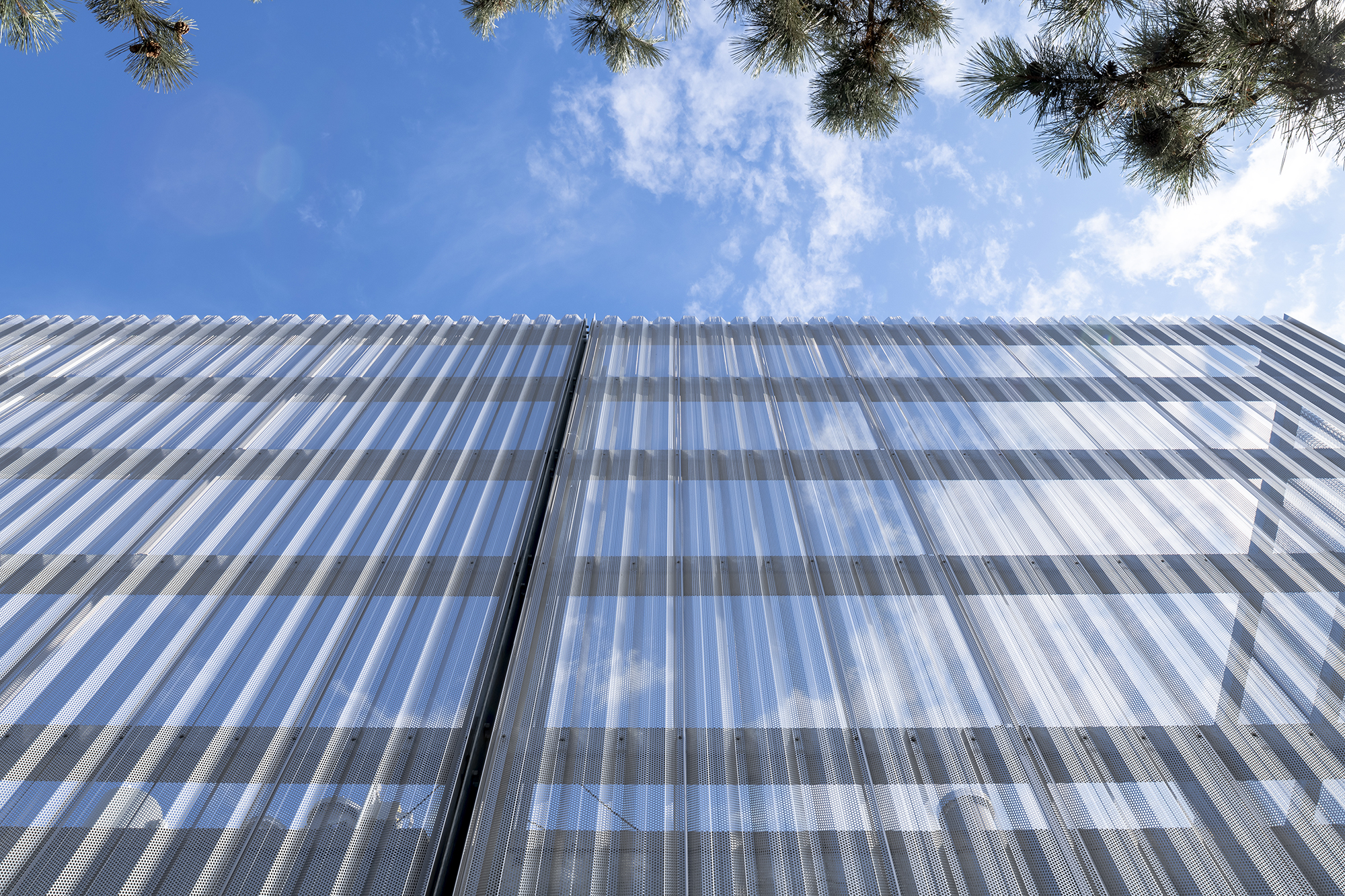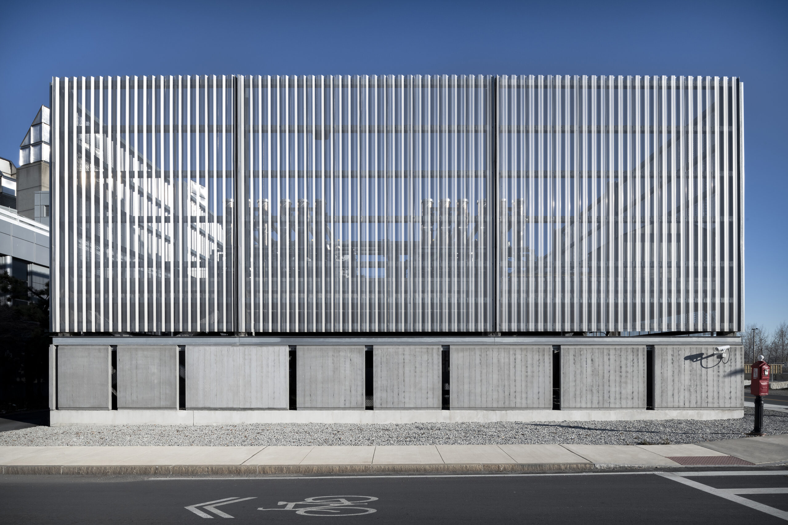 Architecturally finished precast concrete panels spaced to allow flood waters to pass through provide a visual screen at the base of the station, and protect the steel structure from heavy truck traffic on adjacent streets. The upper level of the platform is clad in a modular system of perforated, corrugated, stainless steel paneling allowing for needed ventilation of the electrical equipment. The de-mountable sections facilitate off-site prefabrication of cladding elements, as well as future removal as dictated by equipment maintenance and replacement needs. The material palette and detailing reflect the highly utilitarian character and industrial context of the construction, while providing a sleek and contemporary finish to a much needed piece of public infrastructure.