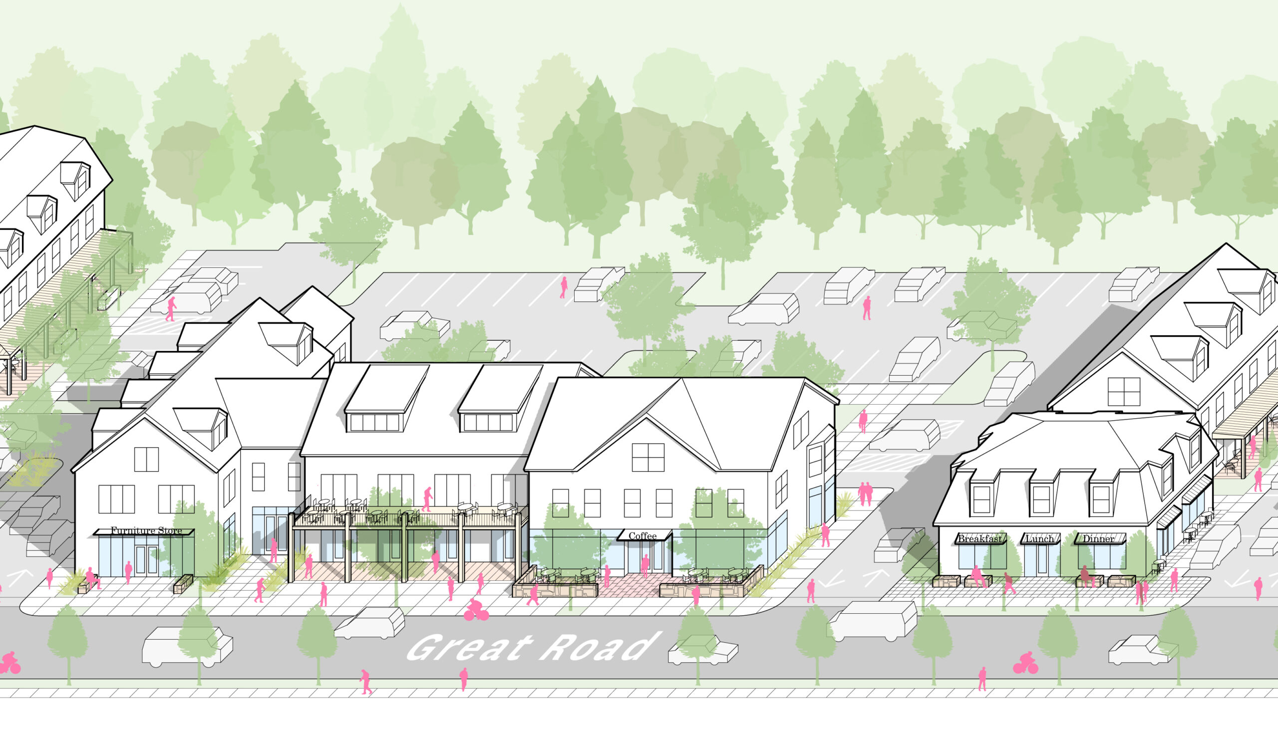 First, at the lot scale, buildings will sit close to the front property line to greet the pedestrian while parking shall be relocated to the rear, hidden from view. At the massing scale, buildings will reference New England farmhouses in terms of height and assemblages, ensuring that they remain moderate in scale and yet capable of accommodating large floorplates necessary for contemporary uses. At the architectural scale, building components like dormers and gables will be designed in proportion to those found in Littleton. Lastly, at the building frontage scale—the area encompassing the building’s façade to the front property line, ground floor uses will engage the pedestrian and materials shall reflect those of rural landscapes.