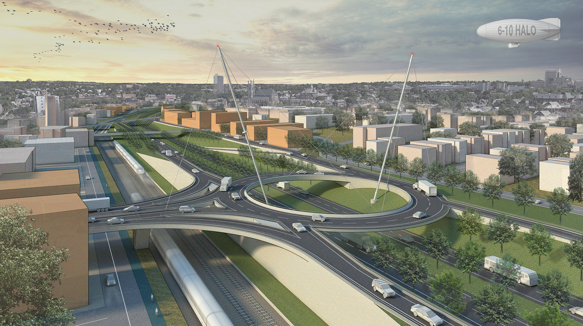 Working with the City of Providence, Utile and NelsonNygaard helped to reimagine the deteriorating urban interchange and highway known as the 6-10 Connector, which runs between the Olneyville neighborhood and downtown Providence. The City/Utile team proposed an elevated rotary, dubbed the “halo”, and other strategies to slim the highway’s footprint and rationalize connections to and from surrounding neighborhoods. The new design aims to increase the amount of developable land, reconnect isolated neighborhoods, untangle traffic snarls, and improve connections for walking, biking, and transit.